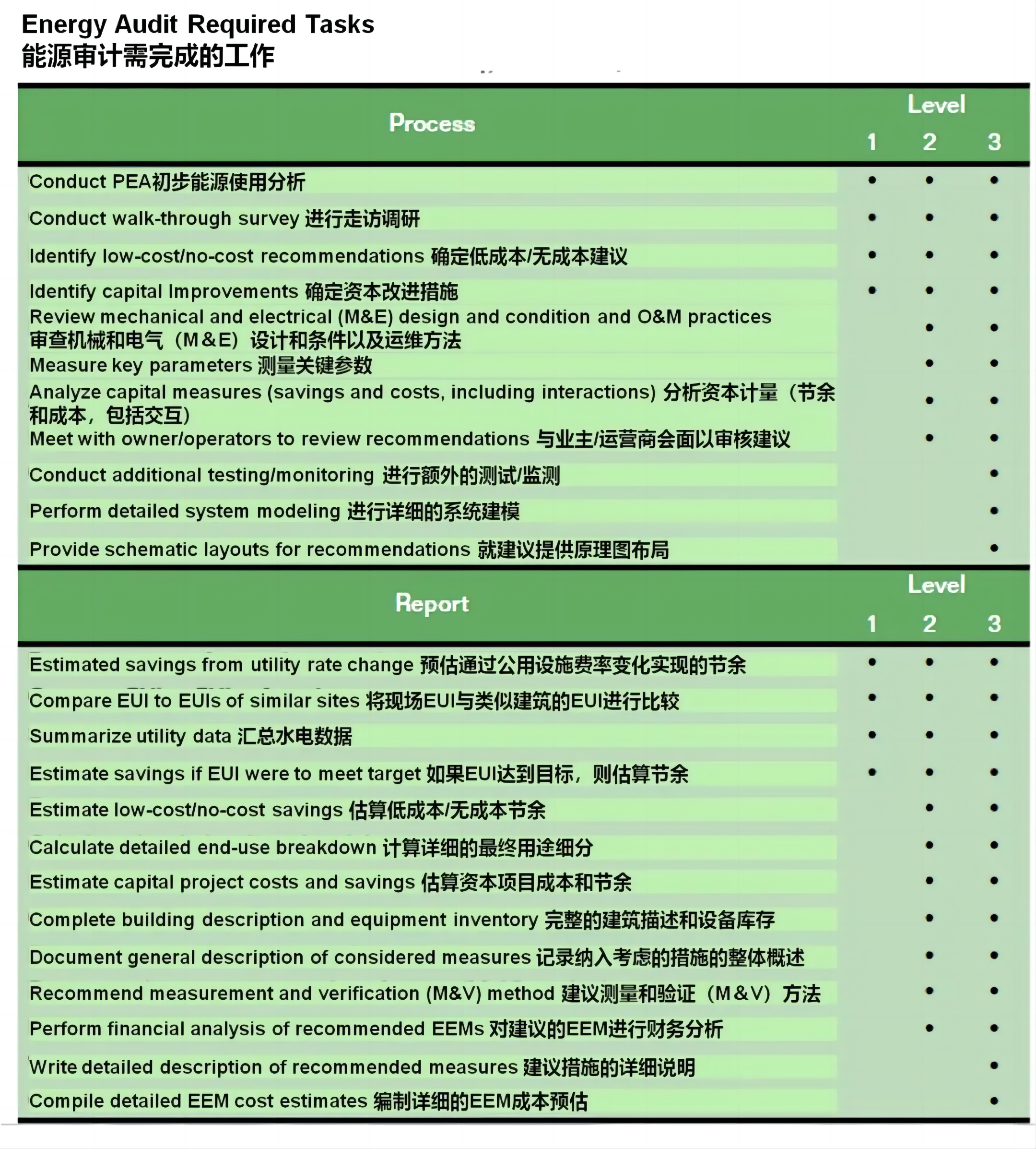 ASHRAE能源审计覆盖的范围与审计报告详细度,随审计等级(Level1、Level2、Level3)的增加而增加。