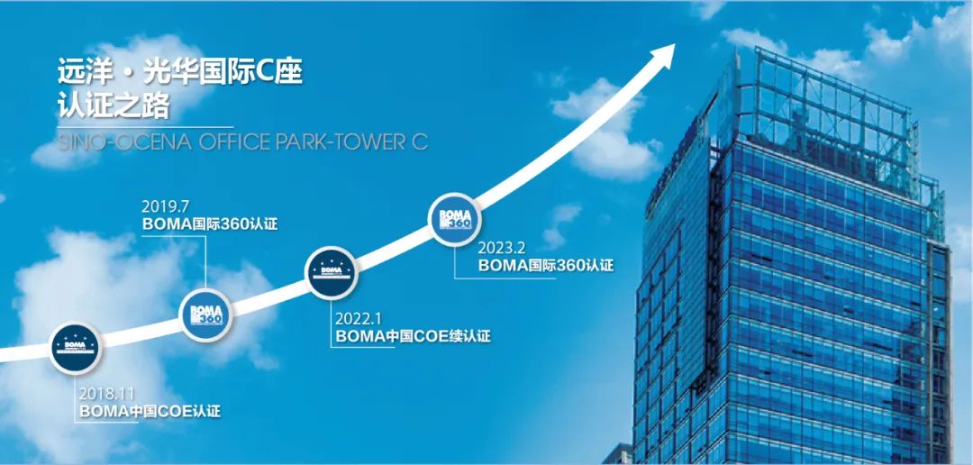 2018-2023年间, 远洋 • 光华国际C座通过采用BOMA认证,实现资产运营品质与管理团队能力在比肩国际、与时俱进、自我突破上的一次又一次跨越。