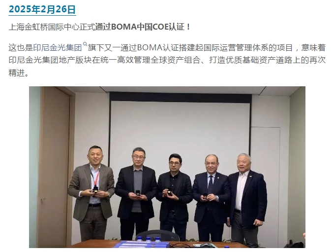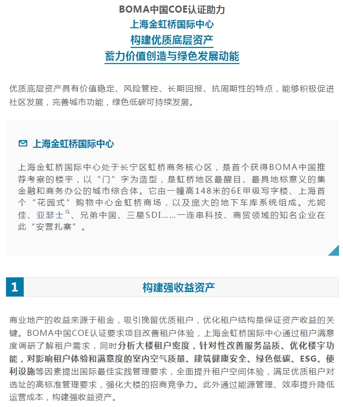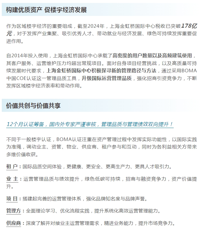 上海金虹桥国际中心通过BOMA中国COE认证!构建楼宇优质资产,蓄力价值创造