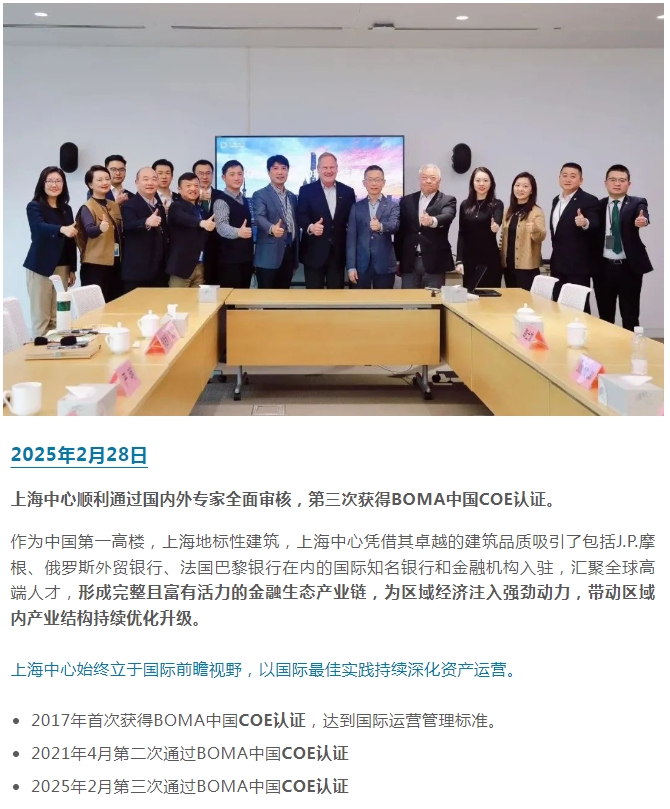 上海中心第三次获BOMACOE认证:8年持续深耕驱动不动产价值韧性增长