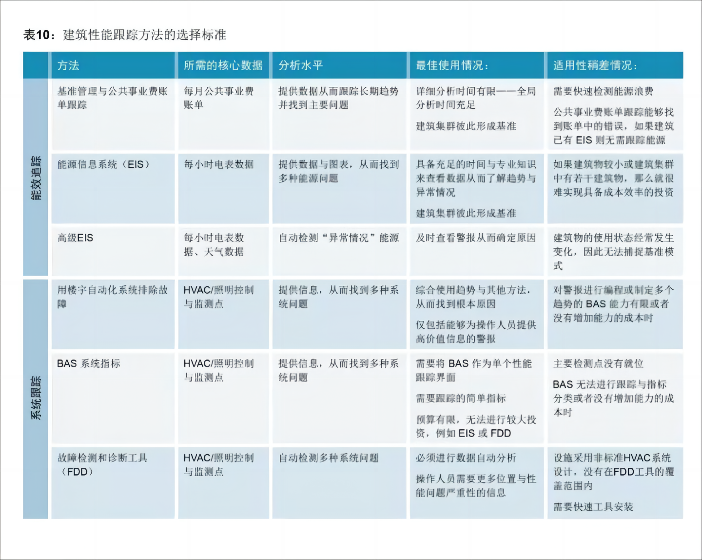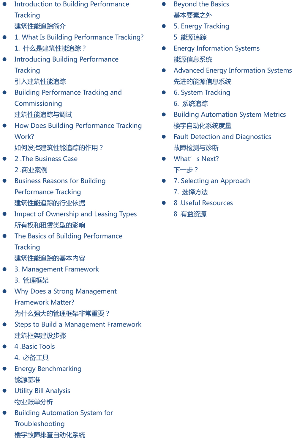 指南介绍了检测和提高商业建筑能源及系统性能的流程与步骤,提供一系列建筑性能跟踪实用工具,对选择正确追踪策略提供指导建议。手册适用于多类型建筑,有助于业主和管理者通过适当的工具实现效能提升,达到建筑运营成本降低、资产升值的目的。